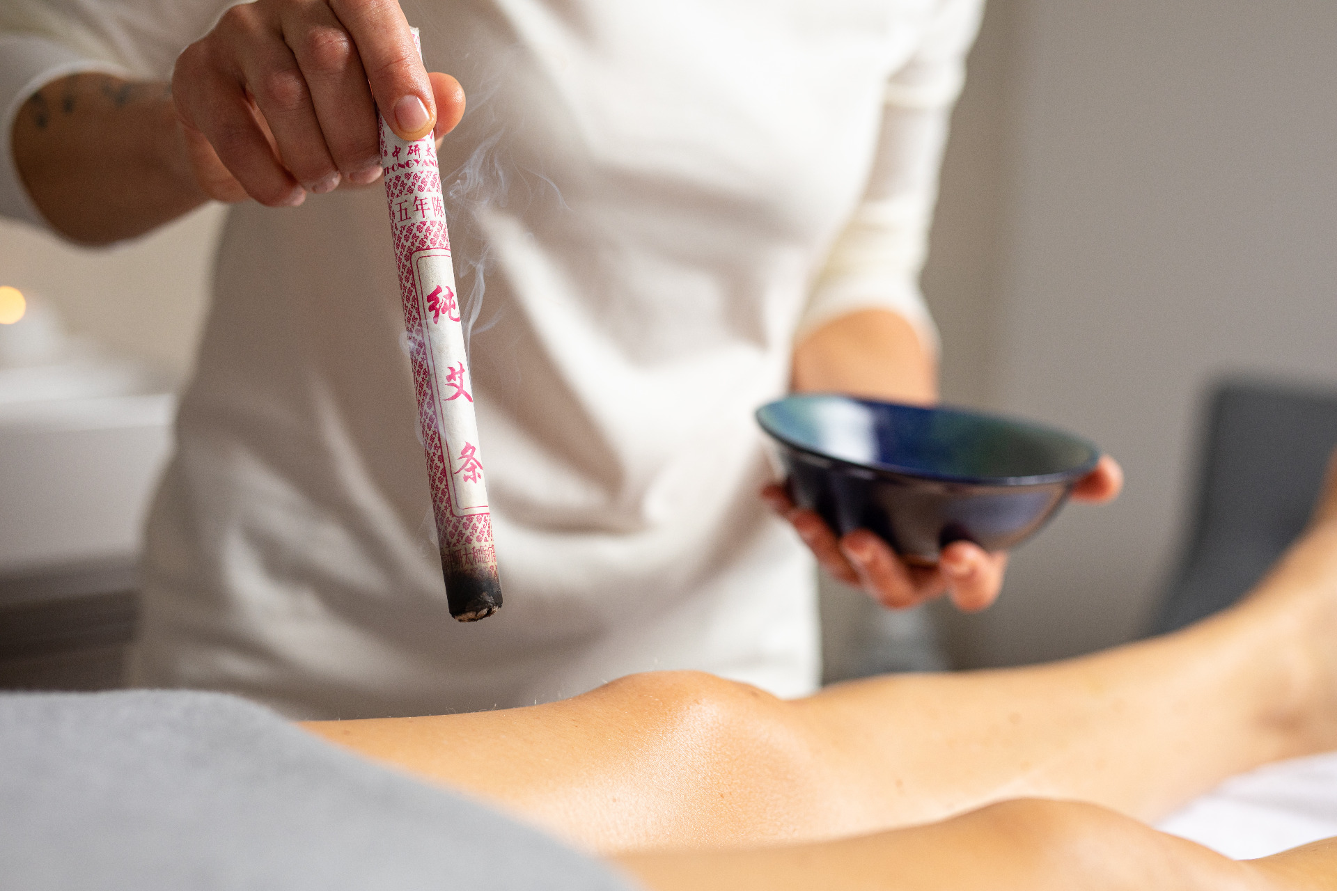 Na rozdíl od akupunktury se do těla nic nezapichuje – moxa pracuje skrze teplo, vůni a jemnou vibraci byliny.